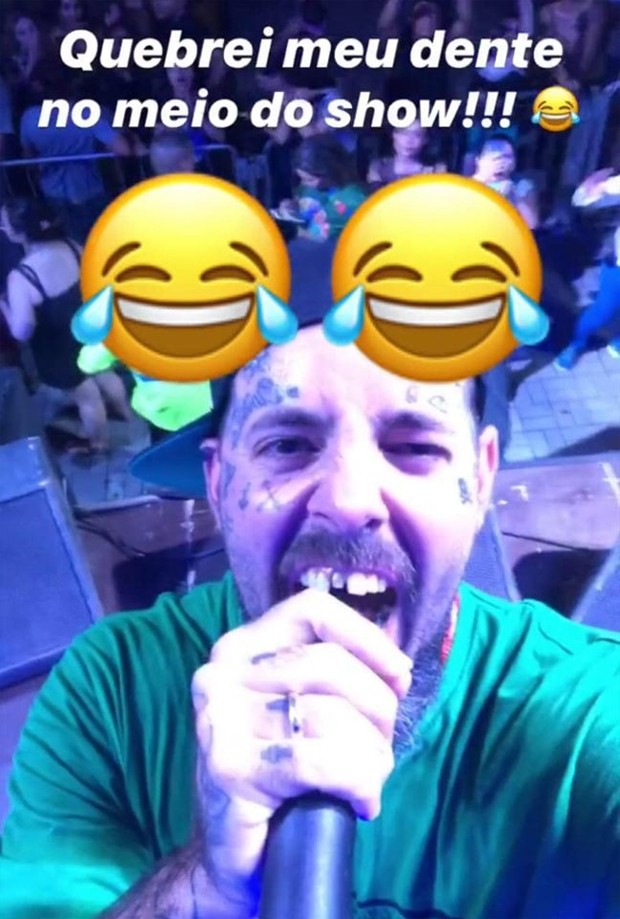 "Ontem, no meio do show em Manaus, eu me empolguei e dei com o microfone na boca com tanta força que voou meu dente. Eu não vou ver isso sozinho. Vocês vão ter que ver junto comigo", escreveu ele no Facebook. Horas depois, Tico foi ao dentista para consertar o dente. "Está ridículo isso aqui, ele vai me salvar", disse o cantor dando risada.