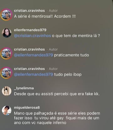“Bora galera! Muita mentira”, escreveu ele nos stories do Instagram. Em seguida, reforçou nos comentários: “A série é mentirosa! Acordem!”. Quando questionado sobre o que seria inverídico, respondeu que “praticamente tudo” e completou: “Tudo pelo ibope”.