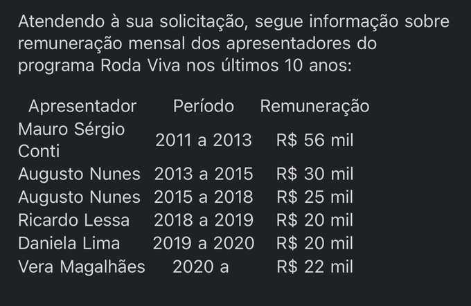 A publicação deixou explícita a remuneração mensal dos apresentadores do "Roda Viva" nos últimos dez anos. Mauro Sérgio Conti, que esteve à frente do programa de 2011 a 2013, ganhava R$ 56 mil.