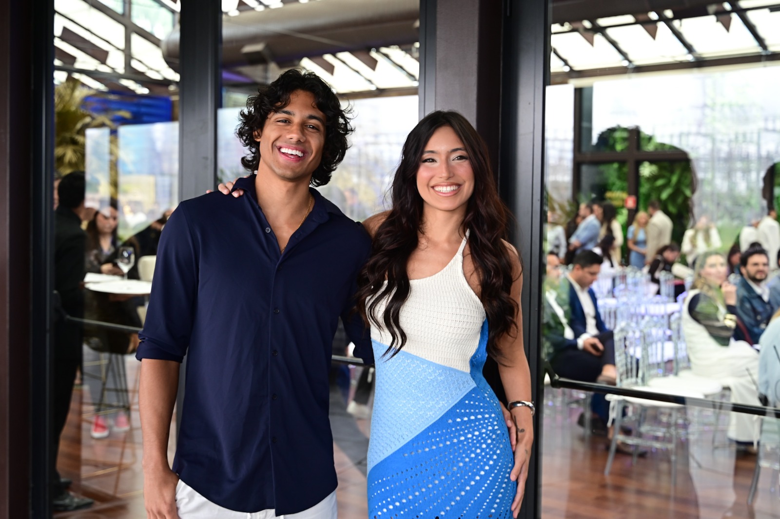 Para o evento, eles optaram por looks harmonizados: Vanessa apostou em saia azul e blusa branca, enquanto Lucas escolheu calça branca e camisa azul, acompanhando a ação promovida por uma marca de estética.