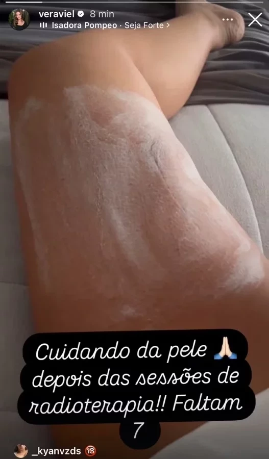 Nos stories de seu perfil no Instagram, ela contou como vem cuidando da pele após as sessões do tratamento, mostrando uma foto da coxa com bastante creme por cima. Ela ainda disse que agora faltam apenas sete sessões.