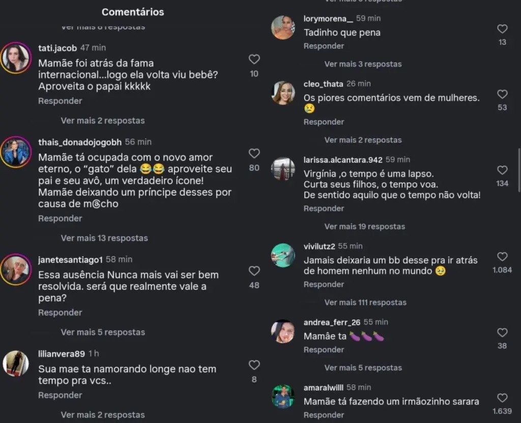 A publicação, no entanto, provocou reações intensas entre os seguidores. Nos comentários, muitos internautas direcionaram críticas a Virgínia, que está em Madri, onde mora o atual namorado. “Tadinho, dá até pena”, escreveu uma seguidora. “Eu jamais deixaria um bebê desse para ir atrás de homem nenhum”, comentou outra.