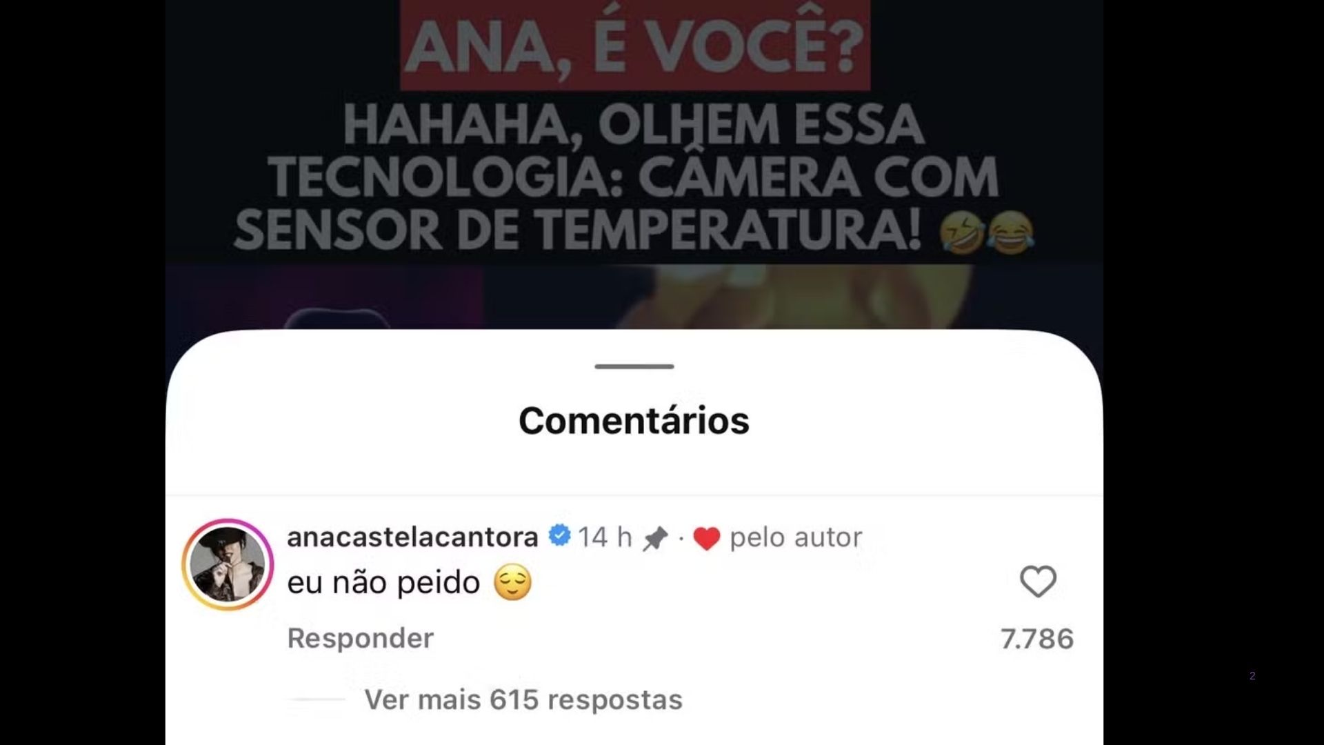 Diante da repercussão, Ana Castela decidiu se manifestar de forma bem-humorada nas próprias redes sociais. A cantora escreveu: "Eu não peido", acompanhando a frase com um emoji de rosto tranquilo, o que arrancou risadas e reforçou seu estilo descontraído perante os seguidores.
