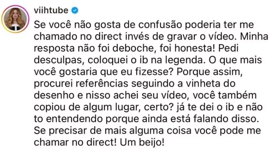 “Se você não gosta de confusão poderia ter me chamado no direct invés de gravar o vídeo. Minha resposta não foi deboche, foi honesta! Pedi desculpas, coloquei o ib na legenda. O que mais você gostaria que eu fizesse? Porque assim, procurei referências seguindo a vinheta do desenho e nisso achei seu vídeo, você também copiou de algum lugar, certo? já te dei o ib e não to entendendo porque ainda está falando disso. Se precisar de mais alguma coisa você pode me chamar no direct! Um beijo!”, disse.