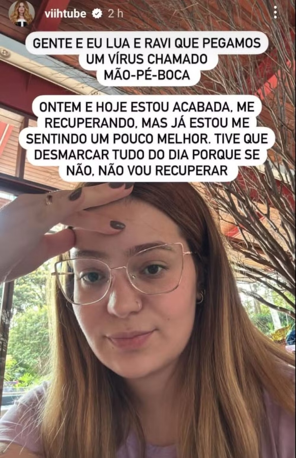 A influenciadora Viih Tube usou suas redes sociais nesta terça-feira (6) para revelar que ela e os filhos, Lua, de 2 anos, e Ravi, de apenas 5 meses, foram diagnosticados com o vírus mão-pé-boca. A esposa de Eliezer desabafou dizendo que tem se sentido "acabada" por conta do vírus, e que chegou a desmarcar todos os seus compromissos profissionais.
