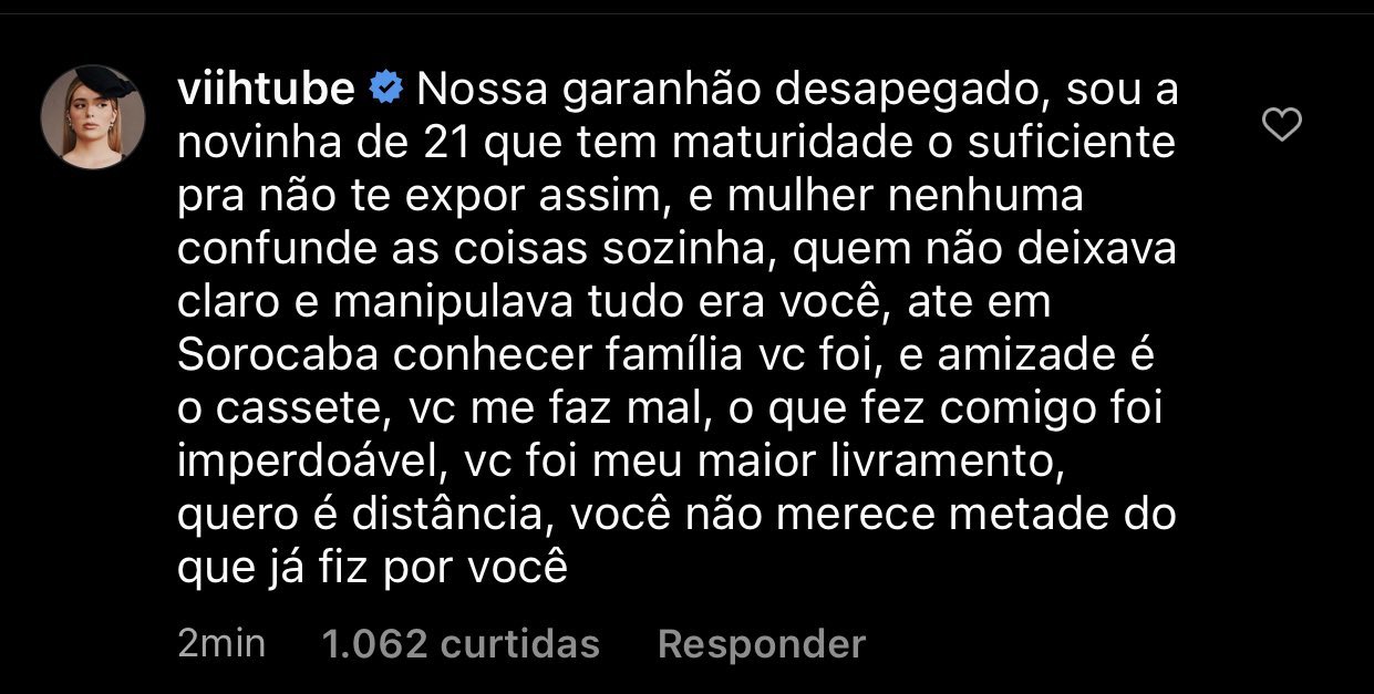 Viih Tube o chamou de manipulador. "Quem não deixava claro e manipulava tudo era você, até em Sorocaba conhecer família você foi. E amizade é o cacete, você me fez mal, o que fez comigo foi imperdoável. Você foi meu maior livramento, quero é distância, você não merece metade do que já fiz por você", completou.