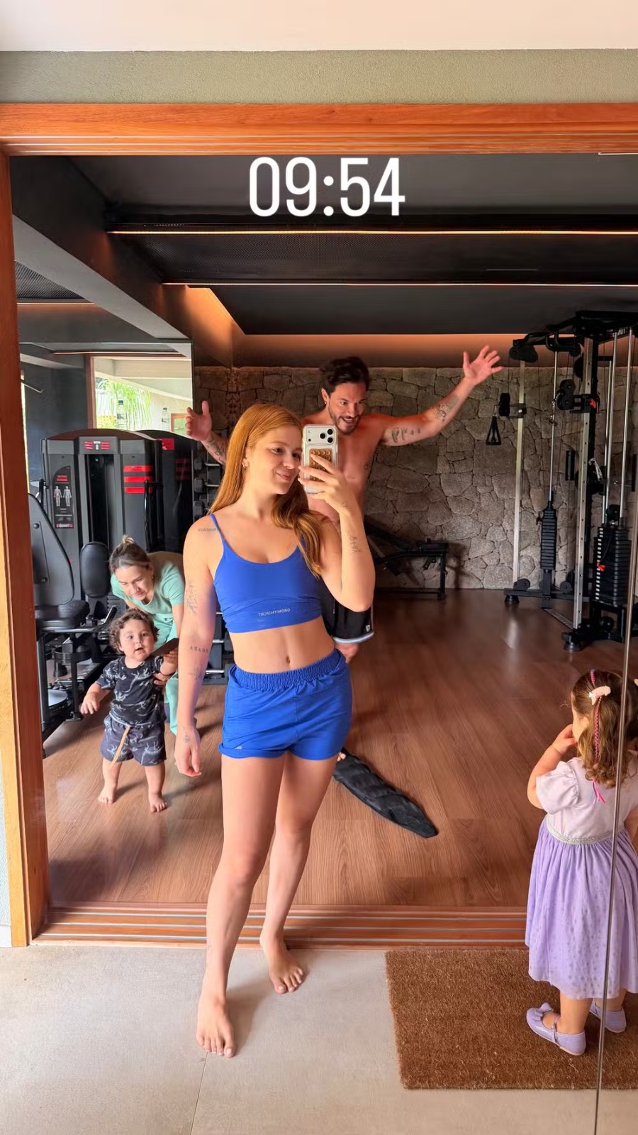A influenciadora Viih Tube, de 25 anos, exibiu seu novo shape em uma selfie no espelho de sua mansão, usando um conjunto fitness marrom. A mudança de hábitos ocorreu após o nascimento de Ravi, seu filho caçula com Eliezer, há um ano.
