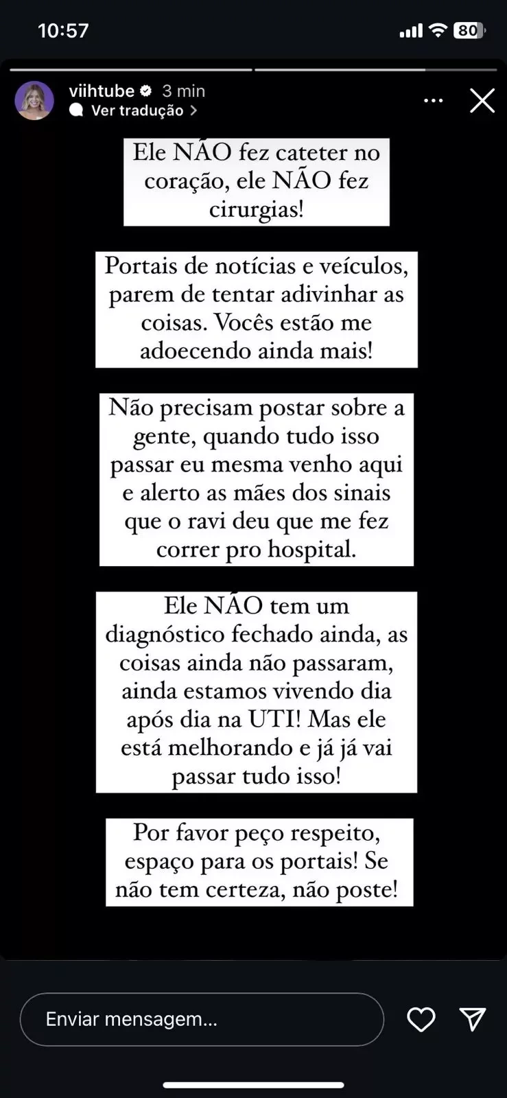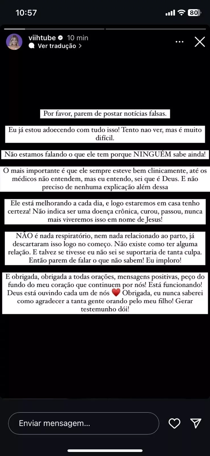“Não estamos falando o que ele tem porque ninguém sabe ainda! O mais importante é que ele sempre esteve bem clinicamente, até os médicos não entendem, mas eu entendo, sei que é Deus”, escreveu Viih.
