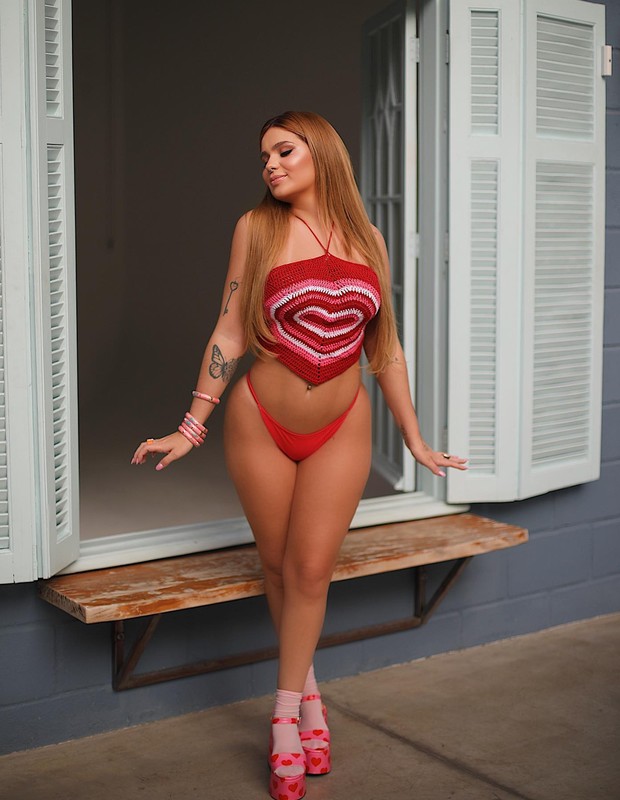 Viih Tube, de 21 anos, compartilhou nesta quinta-feira (27) em seu Instagram parte de seu novo ensaio fotográfico. Um dos looks da sessão de cliques, o escolhido para o feed da youtuber, foi um cropped de crochê, calcinha vermelha e sandália salto bloco estampada.