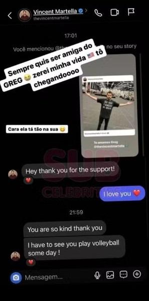 Junto com o print, a famosa escreveu: "Sempre quis ser amiga do Greg. Zerei minha vida. EUA, estou chegando", declarou. “Cara, ela tá tão na sua”, brincou a atleta em referência ao famoso bordão do personagem querido pelos brasileiros.