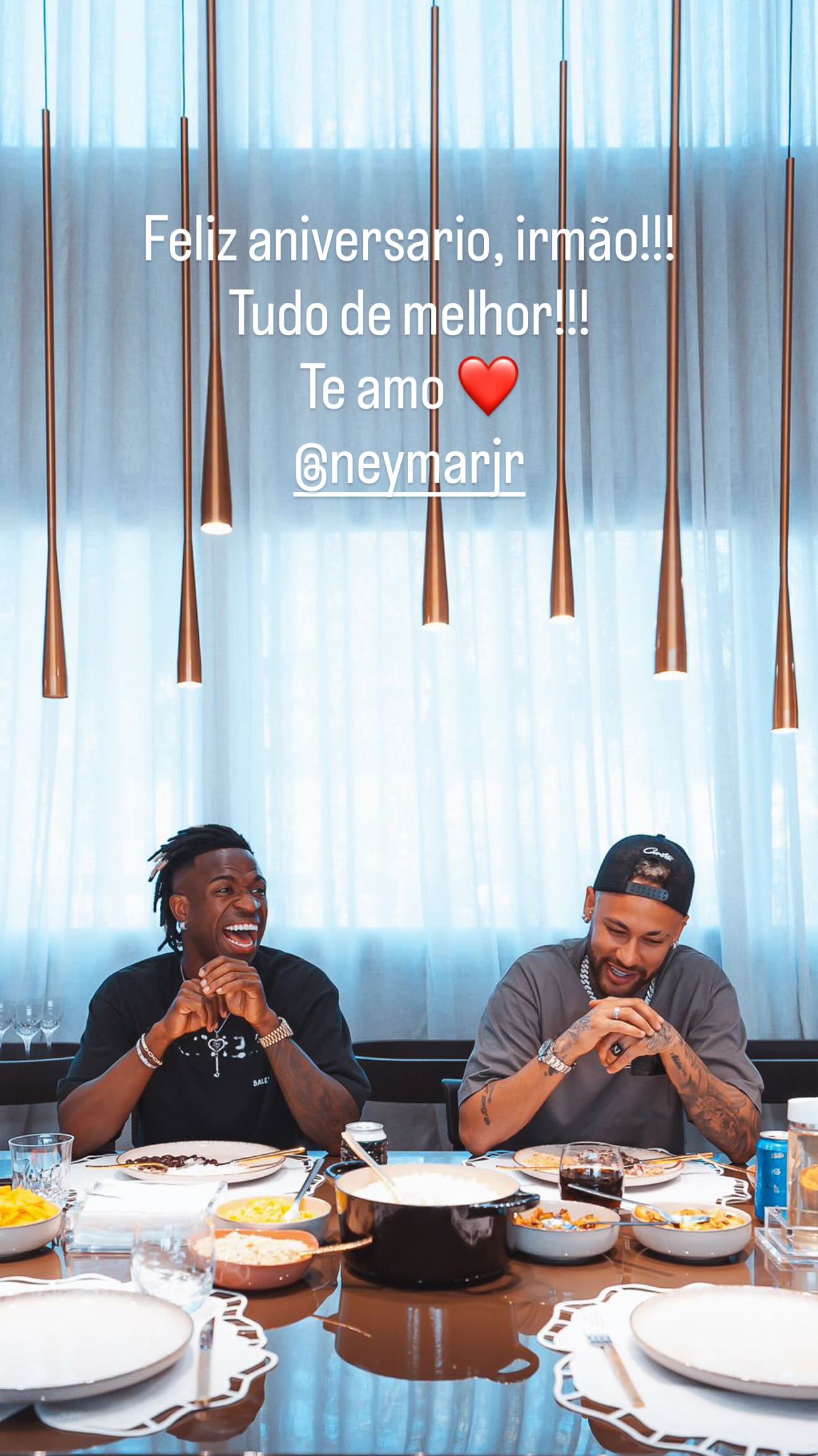 O jogador do Real Madrid, Vini Jr,  usou as redes sociais nesta quinta-feira (5) para celebrar o aniversário de 34 anos do atacante do Santos, Neymar. Em uma mensagem afetuosa, Vini Jr escreveu: "Feliz aniversário, irmão. Tudo de melhor. Te amo", acompanhada de uma foto em que os dois aparecem em um momento de descontração e diversão.