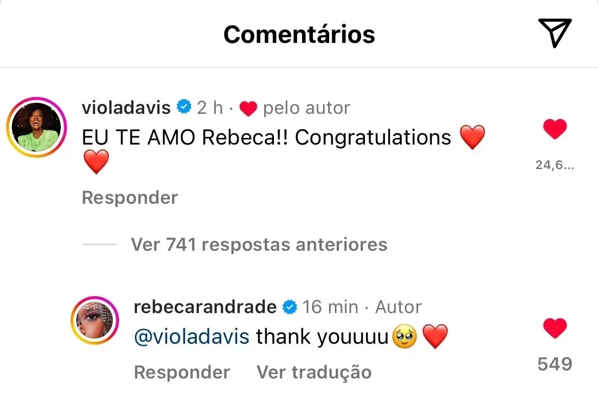 Nos comentários da publicação, onde a brasileira faz uma homenagem ao seu treinador, Francisco Porath Neto, a atriz se arriscou no português e escreveu. "Eu te amo, Rebeca!! Congratulations”, disse.