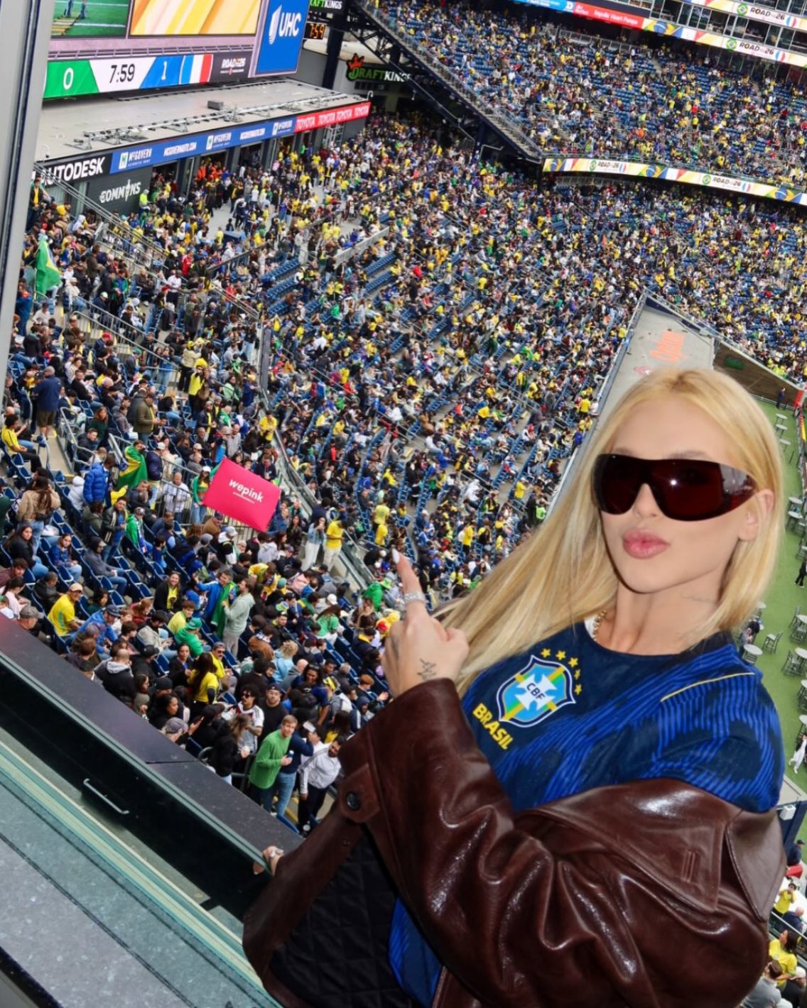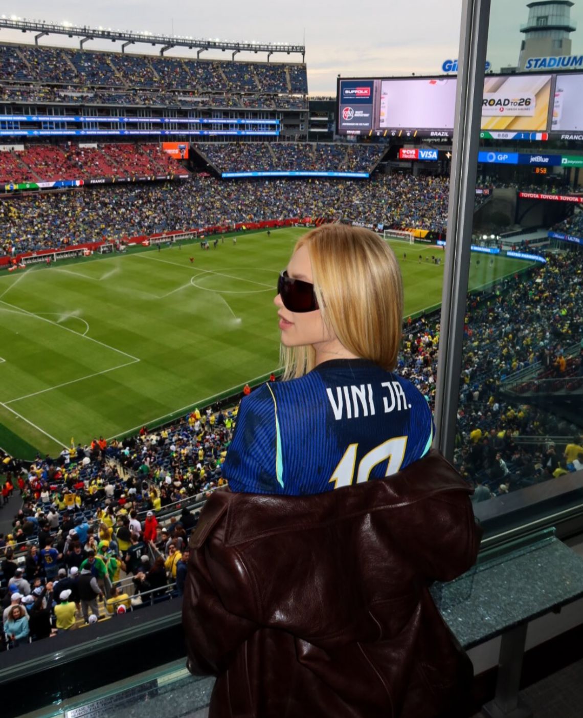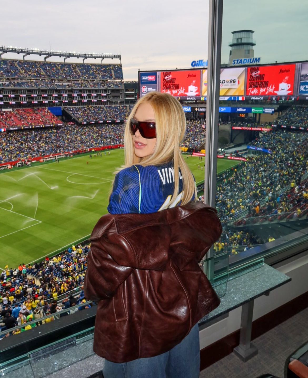 Nos registros publicados, Virginia aparece vestindo a camisa azul da seleção, com o nome de Vini Jr., jaqueta de couro e óculos escuros. Na legenda, ela escreveu “Vamo”, acompanhada de emojis da bandeira do Brasil.