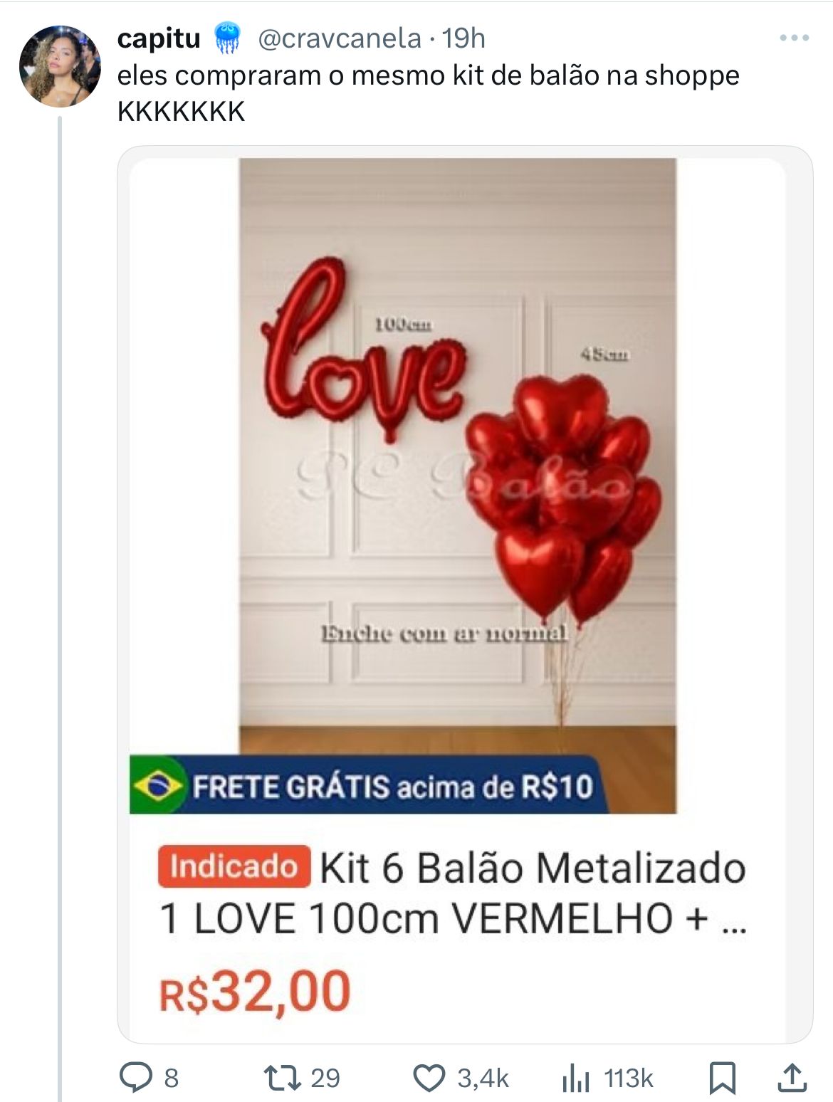 Além disso, comentários nas redes destacaram que o balão usado na decoração seria o mesmo modelo vendido na Shopee por cerca de R$32, alimentando ainda mais as comparações e dúvidas sobre quem teria planejado a surpresa.