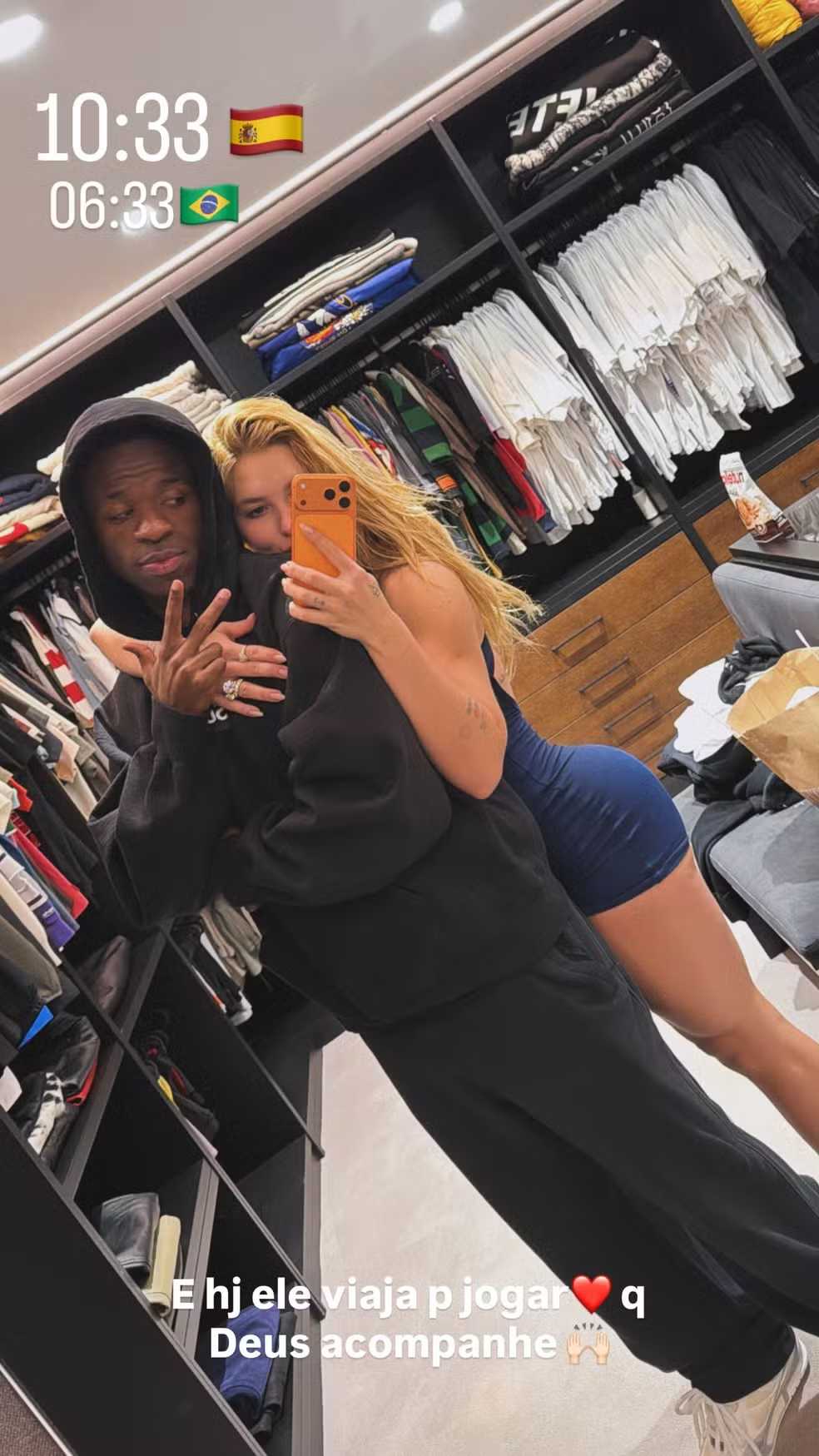 Virginia Fonseca publicou, na manhã desta segunda-feira (3), uma foto em que aparece agarradinha ao namorado Vini Jr, em Madri. Na legenda, a influenciadora mostrou o clima de despedida: "E hoje ele viaja para jogar. Que Deus acompanhe", escreveu.