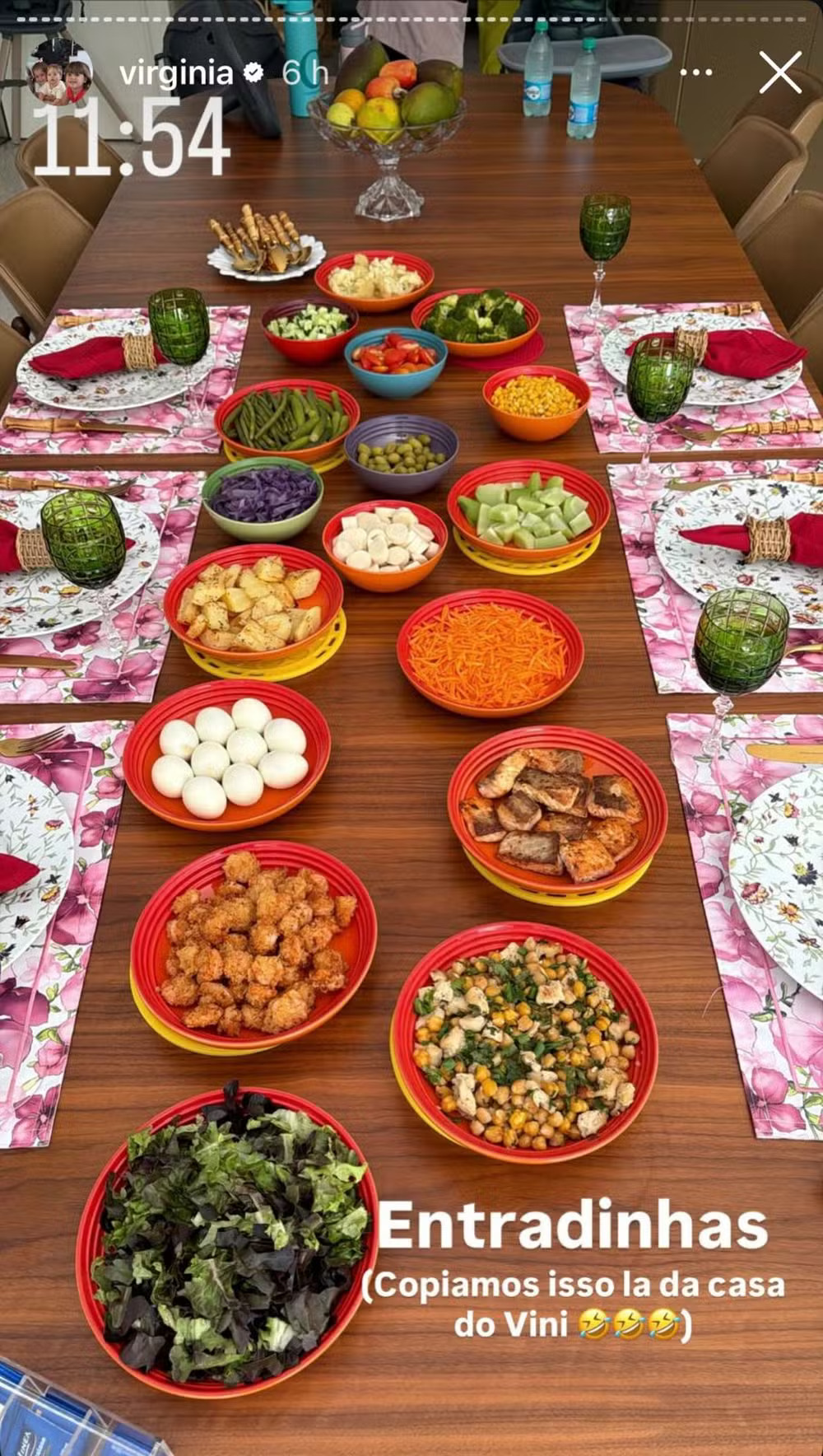 Acostumada a almoçar em família, Virgínia exibiu as porções organizadas como um pequeno buffet, no qual cada pessoa monta o próprio prato. Depois, publicou uma foto ao lado das filhas, já prontas para a refeição. “Entradinhas. Copiamos isso lá da casa do Vini”, escreveu.