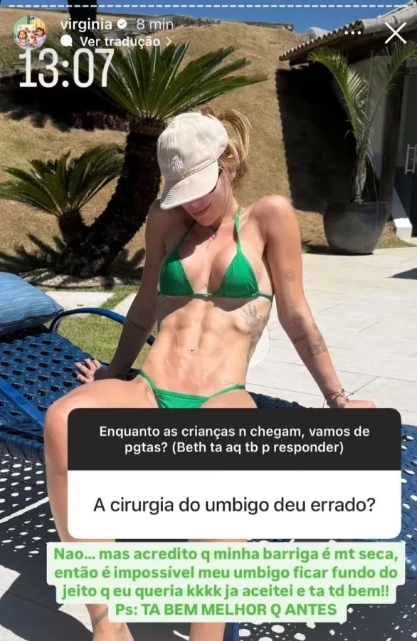 A influenciadora Virginia Fonseca, de 25 anos, compartilhou nesta sexta-feira (28) mais detalhes sobre a cirurgia no umbigo que realizou em janeiro deste ano. A esposa de Zé Felipe disse que o procedimento foi bem-sucedido, mas que, devido à definição de sua barriga, não é possível ter o formato desejado, que seria um umbigo mais "fundo".