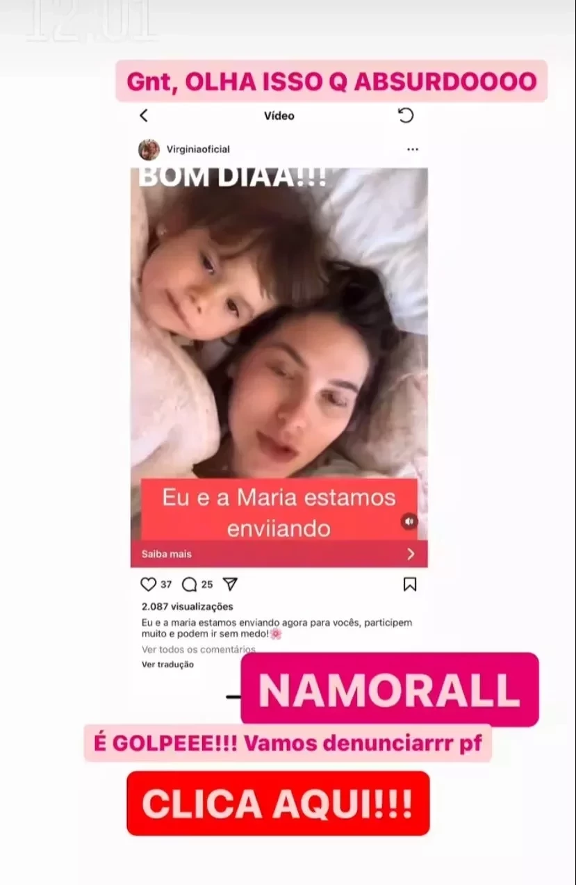 "Eu e a Maria estamos enviando agora para vocês, participem muito e podem ir sem medo", os golpistas escreveram na legenda de uma das publicações. Em seu perfil oficial, Virginia afirmou que o vídeo é falso e se mostrou indignada com a situação: "Gente, olha isso que absurdo! Na moral, é golpe. Vamos denunciar, por favor", ela pediu.