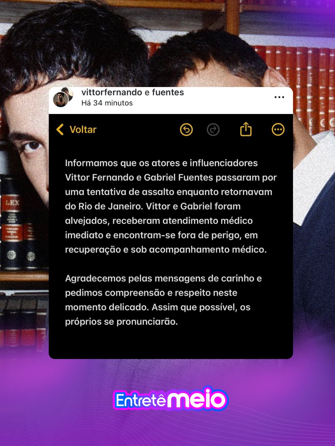 "Informamos que os atores e influenciadores Vittor Fernando e Gabriel Fuentes passaram por uma tentativa de assalto enquanto retornavam do Rio de Janeiro. Vittor e Gabriel foram alvejados, receberam atendimento médico imediato e encontram-se fora de perigo, em recuperação e sob acompanhamento médico. Agradecemos pelas mensagens de carinho e pedimos compreensão e respeito nesse momento delicado. Assim que possível, os próprios se pronunciarão", diz o comunicado.