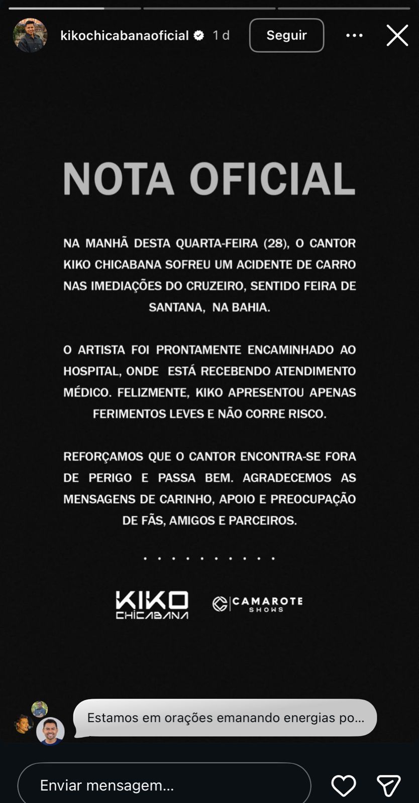 O cantor Kiko, vocalista da banda Chicabana, sofreu um acidente de carro na manhã de quarta-feira (28), em Feira de Santana, segunda maior cidade da Bahia.