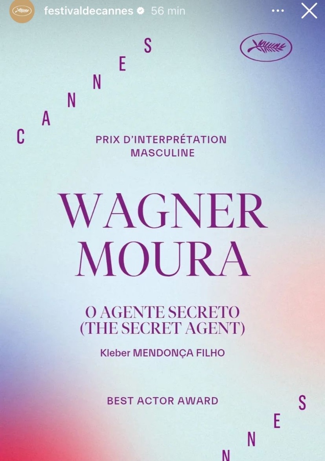 O ator Wagner Moura foi premiado com o troféu de Melhor Ator no Festival de Cannes neste sábado (24), por sua atuação em O Agente Secreto, dirigido por Kleber Mendonça Filho, que também levou o prêmio de Melhor Diretor pelo longa. O diretor subiu ao palco para receber o prêmio em nome de Moura e agradeceu pela honraria.
