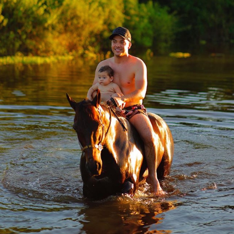 Safadão levou seu filho mais novo, o pequeno Dom, de sete meses, em um passeio de cavalo por um rio, em meio a natureza.