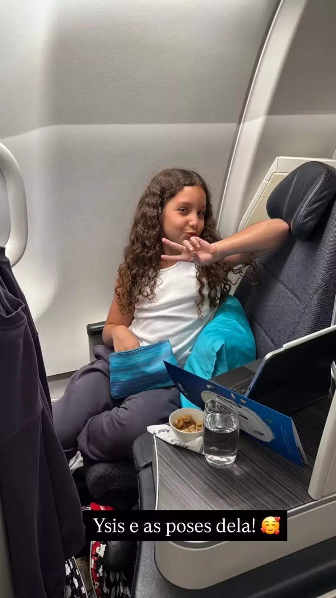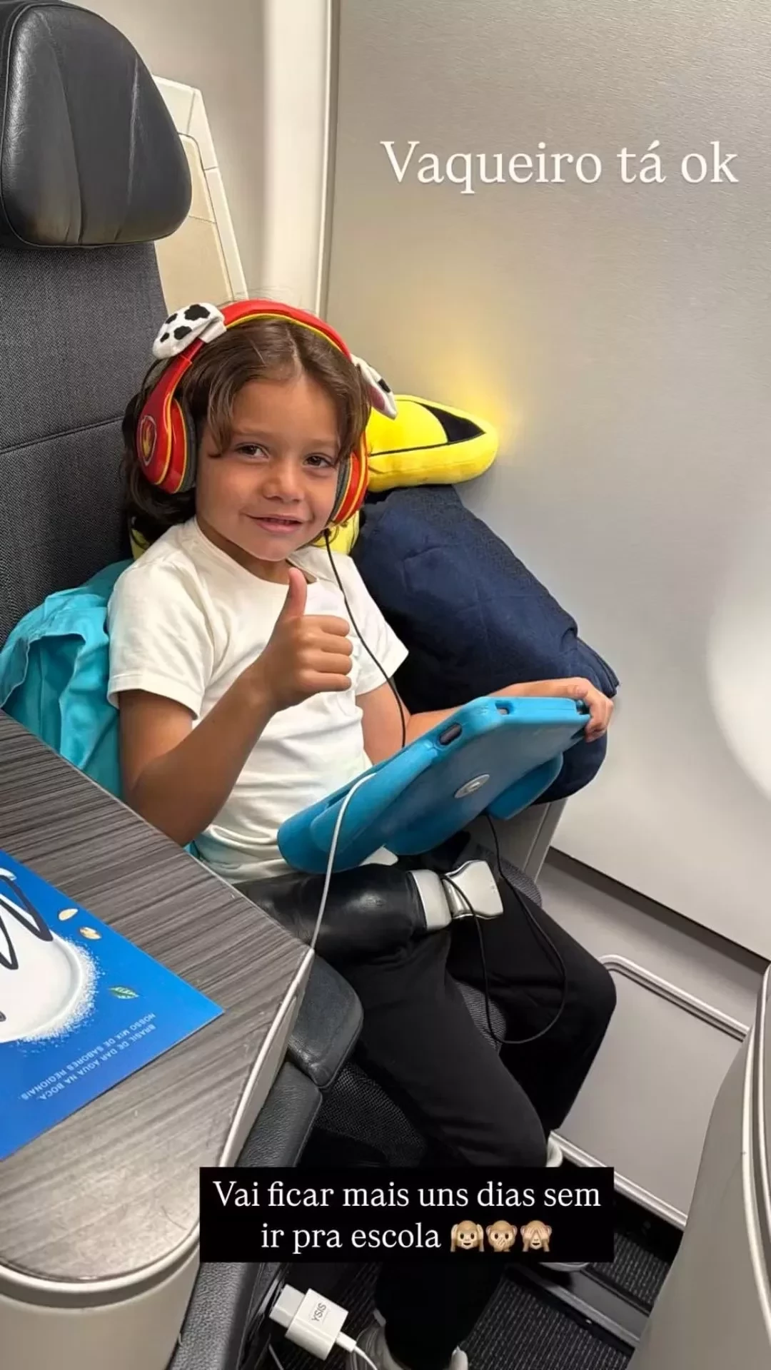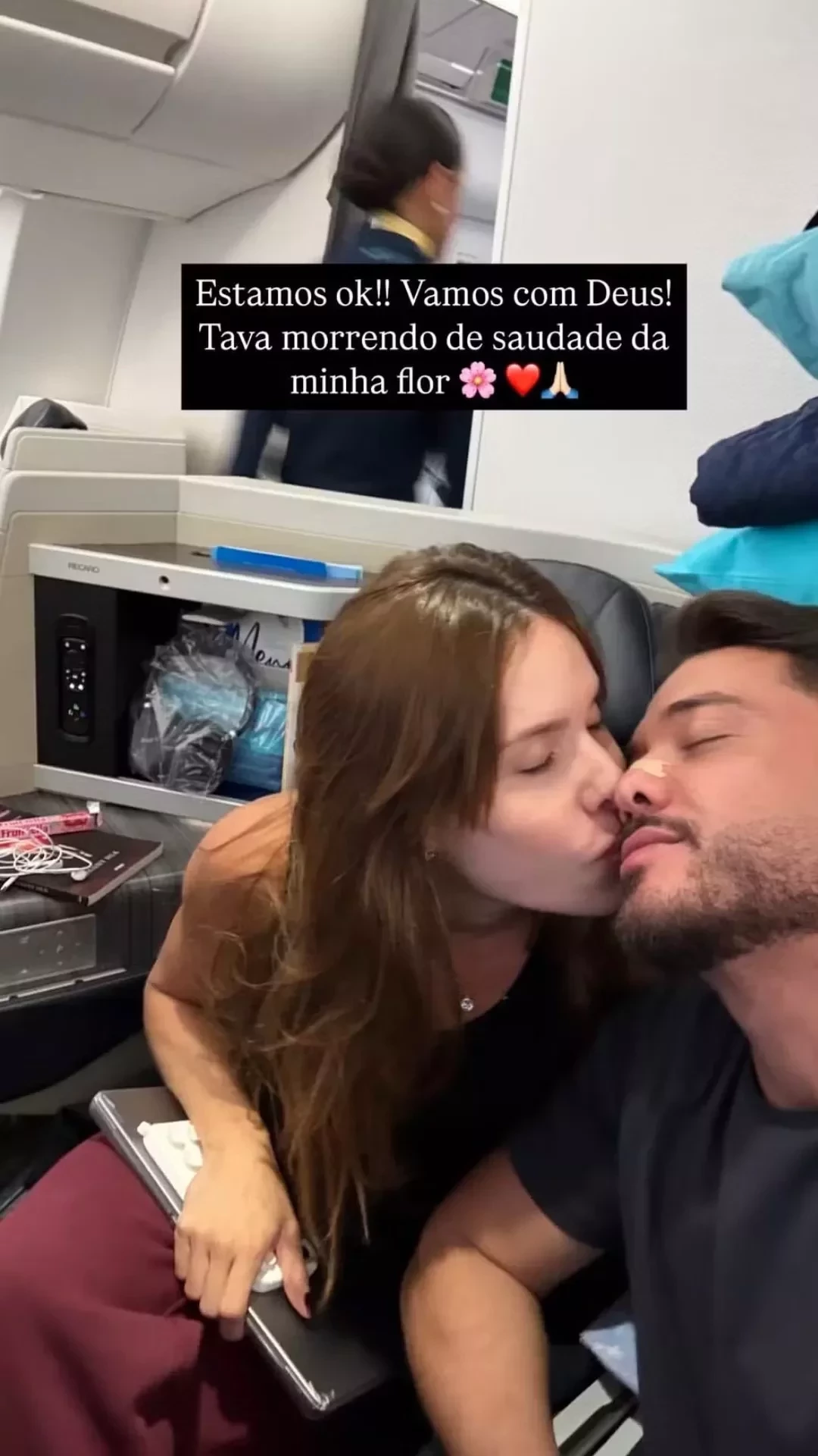 "Estamos OK!! Vamos com Deus! Estava morrendo de saudade da minha flor", declarou-se ele à esposa, compartilhando uma imagem do casal se beijando durante o voo. "Vaqueiro está ok. Vai ficar mais uns dias sem ir pra escola", escreveu ao exibir o filho caçula, Dom. "Ysis e as poses dela!", publicou ao mencionar a filha do meio.