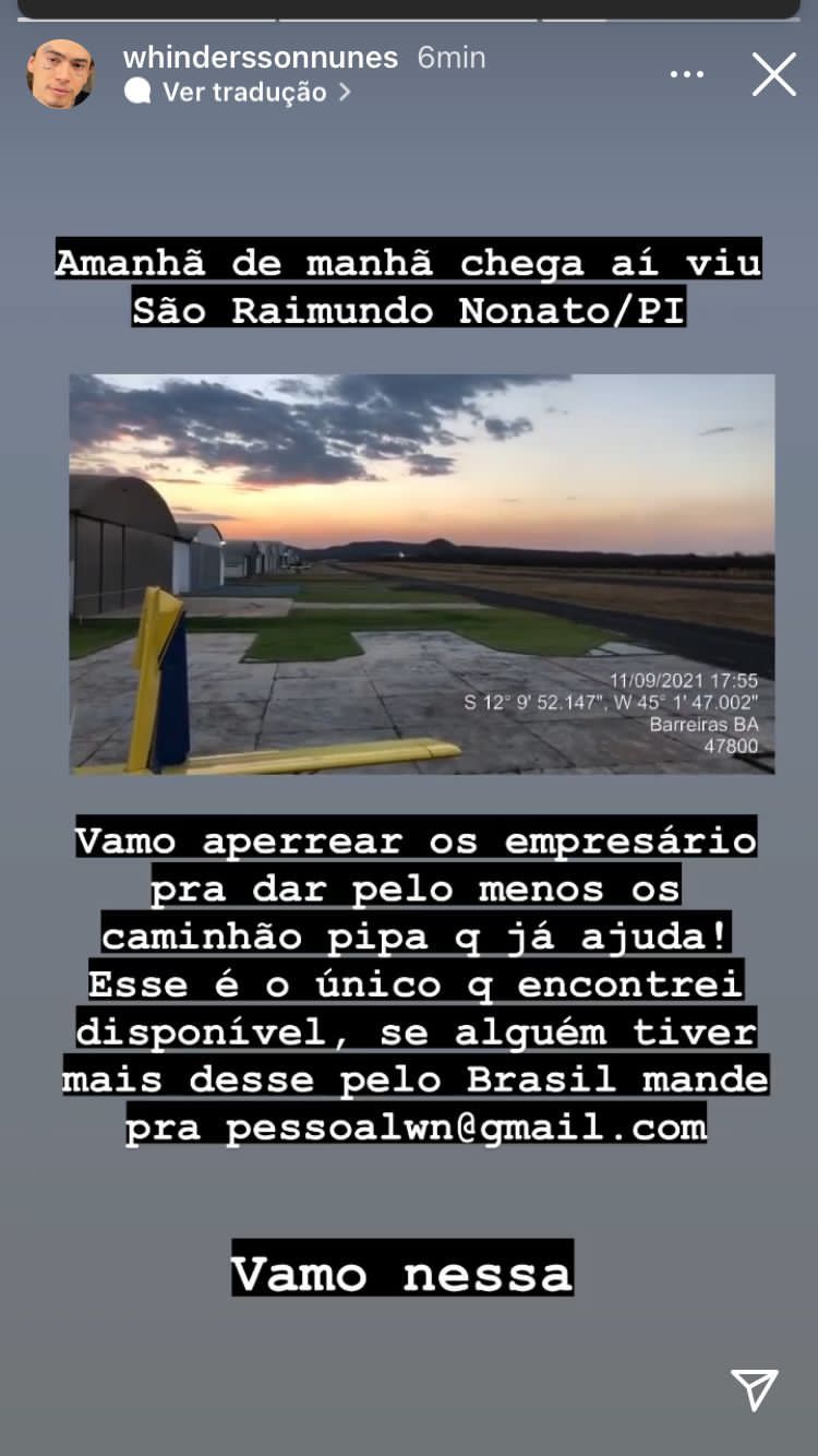 No seu Instagram, Whindersson publicou que o avião chega amanhã (12) de manhã e fez um apelo para que empresários possam se solidarizar com a causa. "Vamo aperriar os empresário pra dar dar pelo menos os caminhão pipa que já ajuda! Esse é o único que encontrei disponível, se alguém tiver mais desse pelo Brasil, mande pra [email protected]", disse.