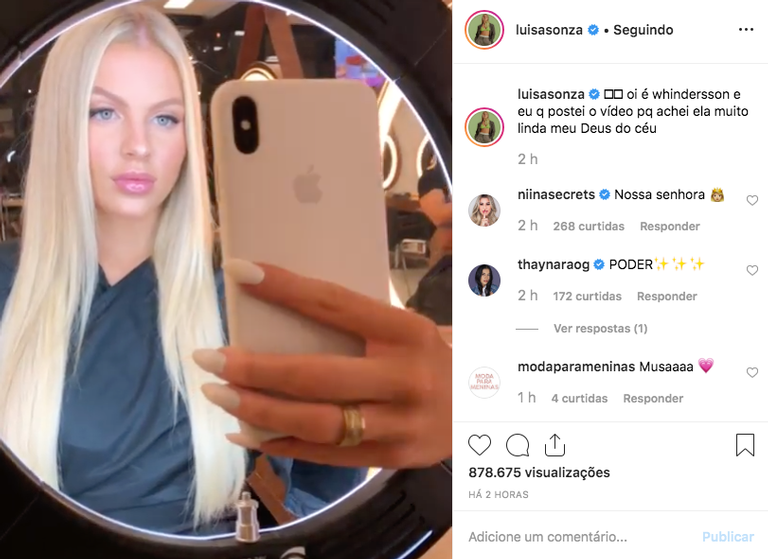 Luísa surgiu completamente platinada e deixou o maridão ainda mais apaixonado. "Oi, é o Whindersson. E eu que postei o vídeo porque achei ela muita linda, meu Deus do céu", escreveu o ator.