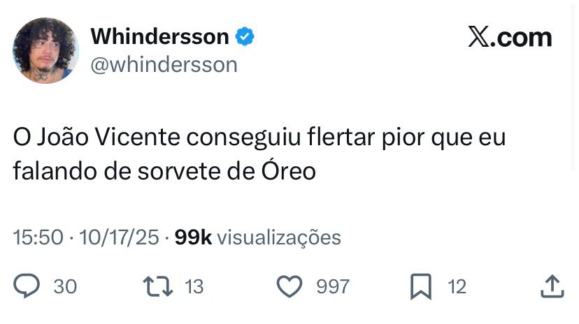 A troca de mensagens rapidamente repercutiu nas redes, gerando comentários de internautas que também ironizaram o suposto romance. “João Vicente busca a testo que não tá nele”, escreveu um seguidor. Outro comentou: “Reunião dos maus flertadores e não me convidaram”.