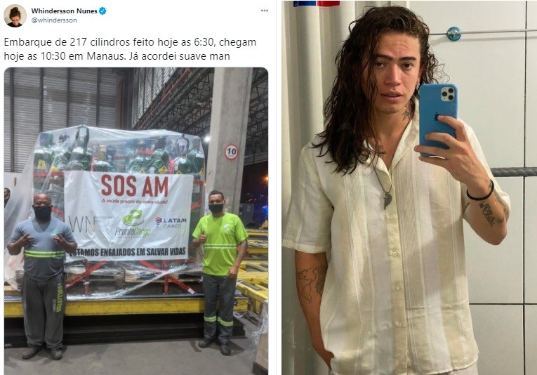 Whindersson Nunes compartilhou uma foto mostrando que enviou mais cilindros de oxigênio a Manaus, no Amazonas. "Embarque de 217 cilindros feito hoje âs 6h30, chegam hoje às 10h30 em Manaus. Já acordei suave, man", postou o humorista e influenciador digital. "Estamos engajados em salvar vidas", completou. As informações são da Quem.