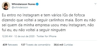 Whindersson Nunes usou seu Twitter na madrugada desta segunda-feira (12) para afirmar que não voltou a seguir Carlinhos Maia, influencer com quem tem um desafeto desde o ano passado. "Eu entro no Instagram e tem vários IGs de fofoca dizendo que voltei a seguir Carlinhos Aaia. Bom eu não sei quem da minha empresa usou meu Instagram, não fui eu, eu não voltei a seguir ninguém", escreveu o humorista. "Eu não vou mais dar entrevistas, notícias sobre mim aqui no meu tt ou no meu show, e ponto", completou.