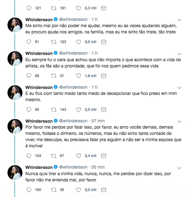 Whindersson, que chama a esposa, Luísa Sonza, de "minha rocha", contou que se sente "triste, tão triste". "Eu vivo rodeado de abutres, de urubus", revelou ele. Após tuitar que não sentia tanta vontade de viver, ele fez questão de frisar que nunca pensou em tirar a vida e que quer fazer terapia. "Eu quero ajuda, e quero viver".