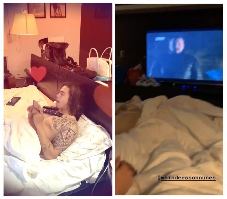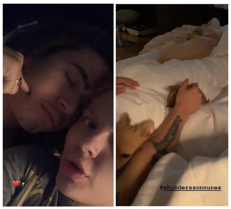 Luísa Sonza usou seus Stories, do Instagram, para mostrar o marido deitado ao lados dos cães no domingo (14). Em outro momento, a cantora abraça e beija Nunes na cama.