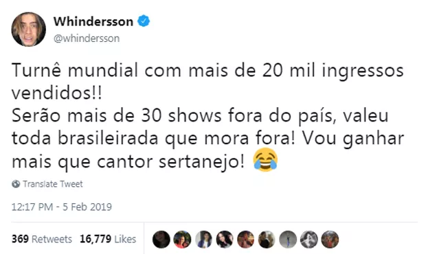 "Turnê mundial com mais de 20 mil ingressos vendidos! Serão mais de 30 shows fora do país, valeu toda 'brasileirada' que mora fora! Vou ganhar mais que cantor sertanejo!", celebrou ele em seu Twitter.