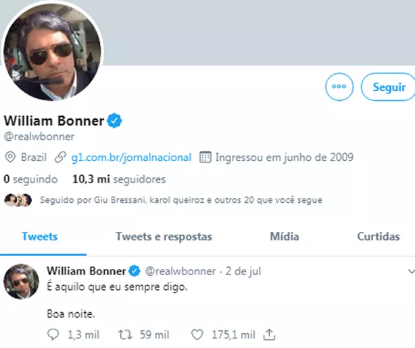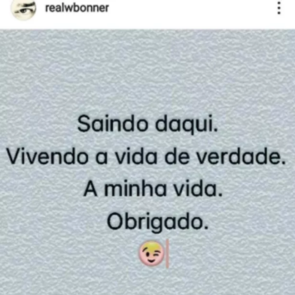 "Saindo daqui. Vivendo a vida de verdade. A minha vida. Obrigado", escreveu ele antes de apagar a conta. No Twitter, ele também não faz publicações desde o dia 2 de julho. "É aquilo que eu sempre digo. Boa noite", escreveu Bonner.