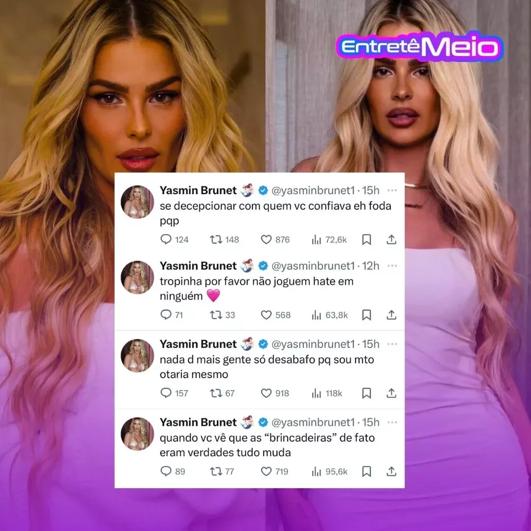 Nesta segunda-feira (15), Yasmin Brunet utilizou seu perfil no X (antigo Twitter), para compartilhar um breve desabafo sobre decepções pessoais. Em sua postagem, ela expressou o desafio de lidar com a decepção ao descobrir que brincadeiras passadas revelaram verdades ocultas. De acordo com as postagens, A modelo teria se decepcionado com alguém em quem confiava.