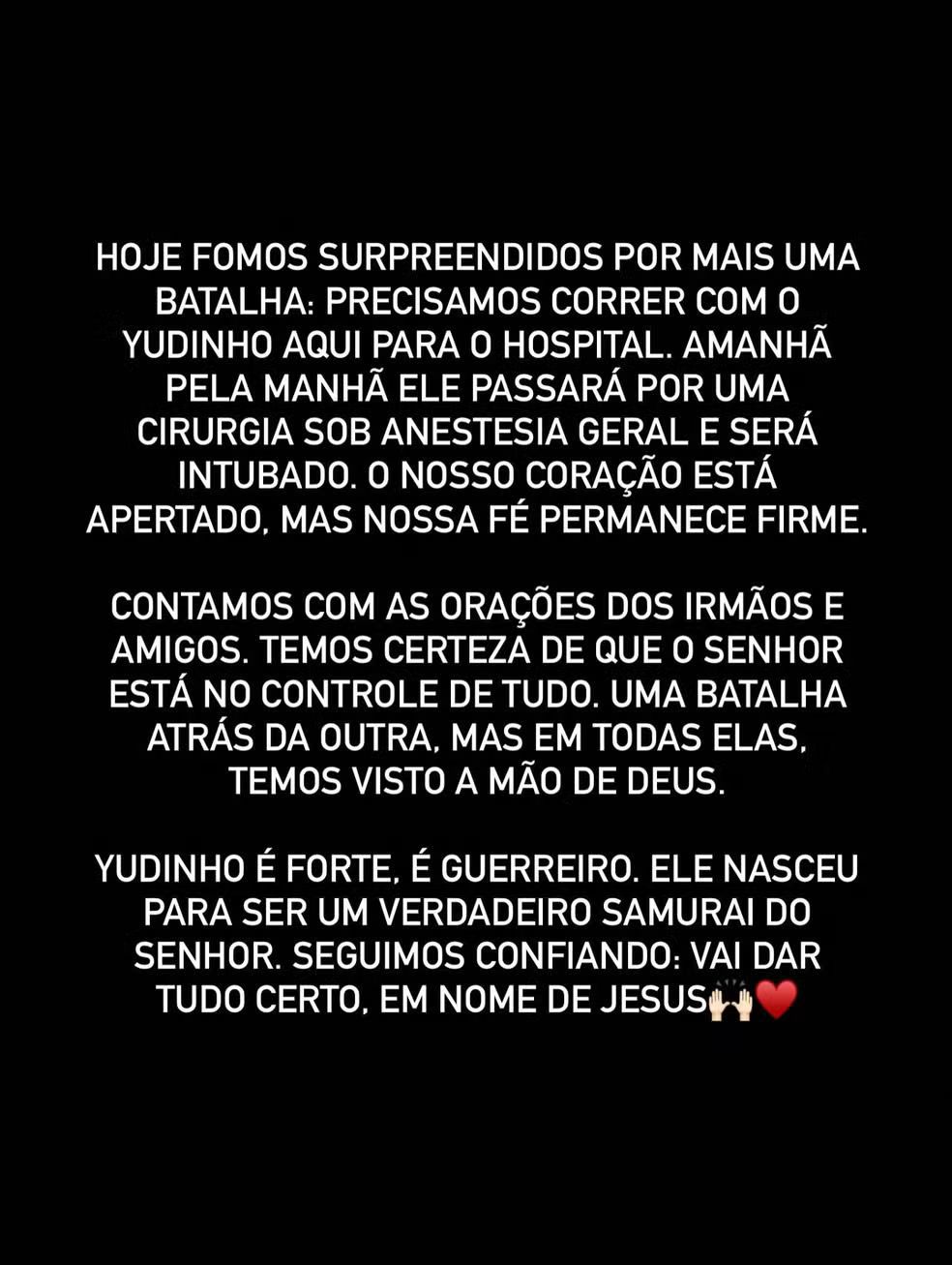 “Deus falou comigo: ‘Vai. Enquanto você cuida da minha obra, Eu cuido da sua casa’. Saí pra pregar o Evangelho com o coração apertado. No caminho, recebi a chamada de vídeo: ’Yudinho estava bem. Vivo. Sorrindo’”, escreveu.