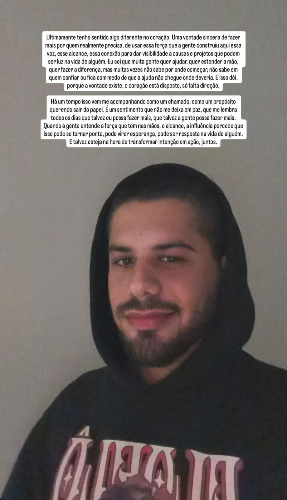 “Ultimamente tenho sentido algo diferente no coração. Uma vontade sincera de fazer mais por quem realmente precisa, de usar essa força que a gente construiu aqui, essa voz, esse alcance, essa conexão, para dar visibilidade a causas e projetos que podem ser luz na vida de alguém”, escreveu.