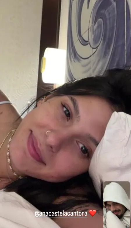 Zé Felipe de 27 anos, compartilhou nas redes sociais uma foto em vídeo chamada com Ana Castela, de 21, durante a madrugada desta terça-feira (28). A cantora, que está em turnê em Portugal, aparece deitada, enquanto o cantor cobre o rosto com o moletom. Nos stories do Instagram, ele não escreveu nenhuma legenda, apenas adicionou um emoji de coração vermelho.
