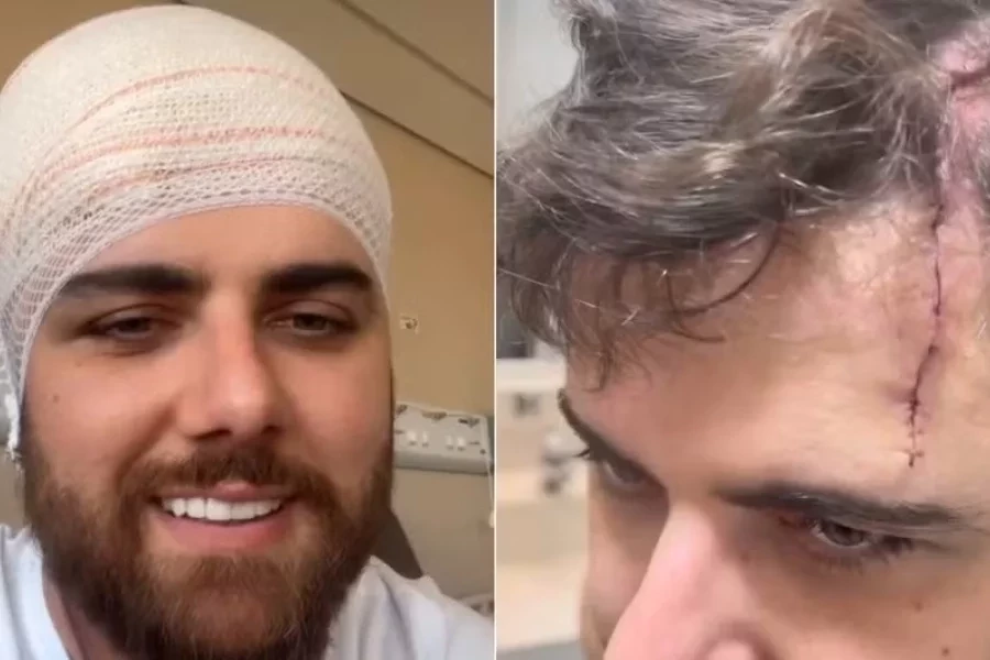A esposa do cantor, Natália Toscano, explicou que o cantor bateu a cabeça em uma estrutura de ferro após passar por um buraco. "A Natália meteu um chifre em mim e eu aproveitei para tirar. Foi para diminuir a testa, que estava muito grande”, brincou Zé Neto.