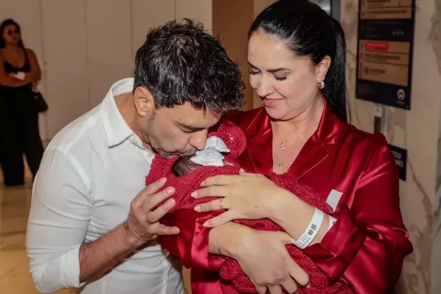Seguindo a tradição de vestir vermelho para atrair boa sorte e saúde ao recém-nascido, tanto a mãe quanto a pequena Clara usaram roupas na cor simbólica. Zezé optou por uma camisa branca, completando o visual elegante da família. Na entrada da maternidade, os três posaram para fotos.