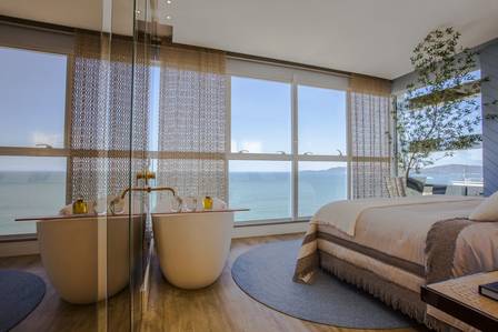O apê de Santa Catarina tem uma vista incrível do mar, no bairro Meia Praia e ganhou o nome de “É o amor”, assim como a fazenda em Goiás. O projeto de arquitetura contemporânea é assinado por Thayane Santana. “Como o casal mora em São Paulo, tem uma vida mais corrida, urbana, quis trazer algo mais leve, mais praiano, com o nosso estilo, a fim de relaxar e ficar mais tranquilos”, explicou Thayane num vídeo publicado em seu canal no Youtube.
