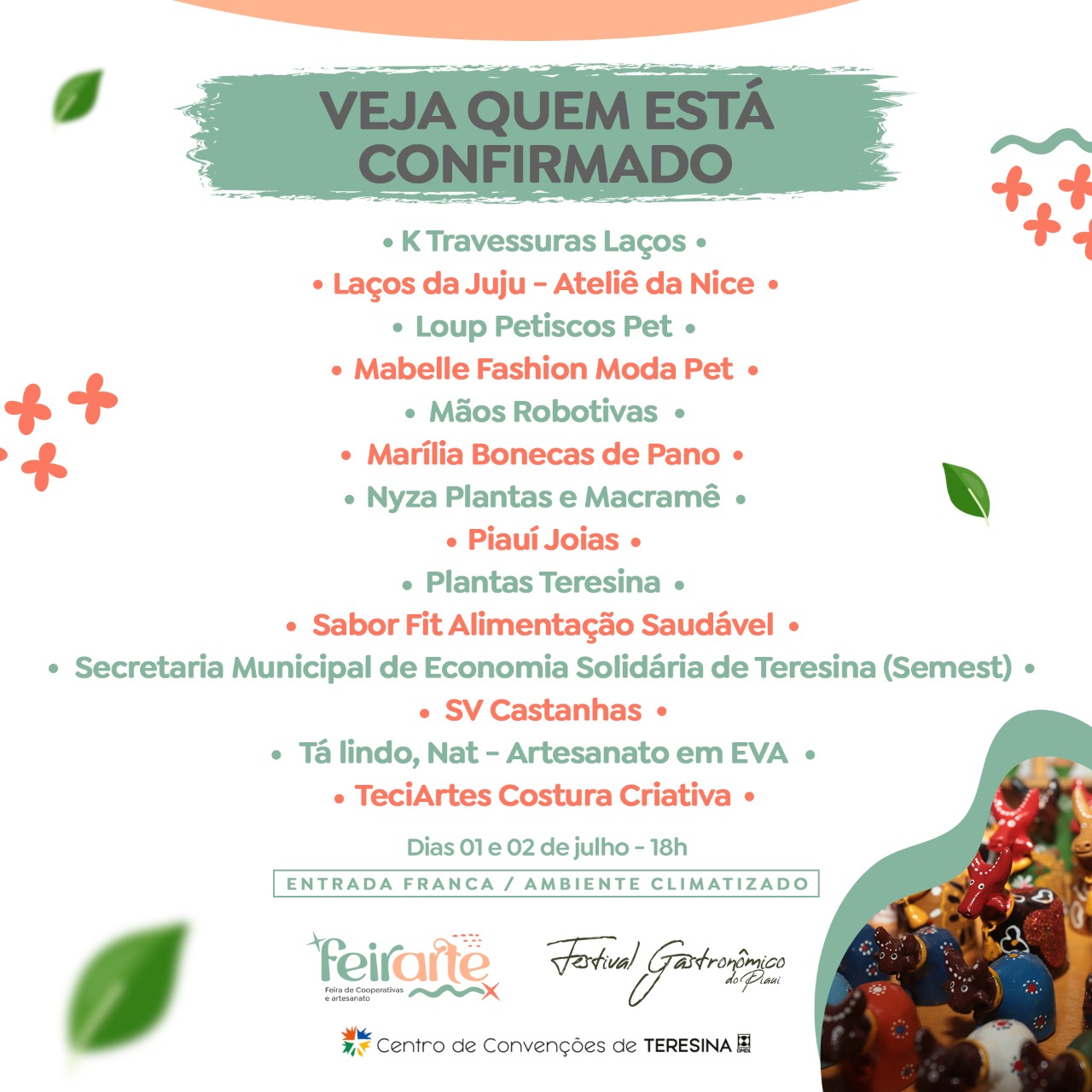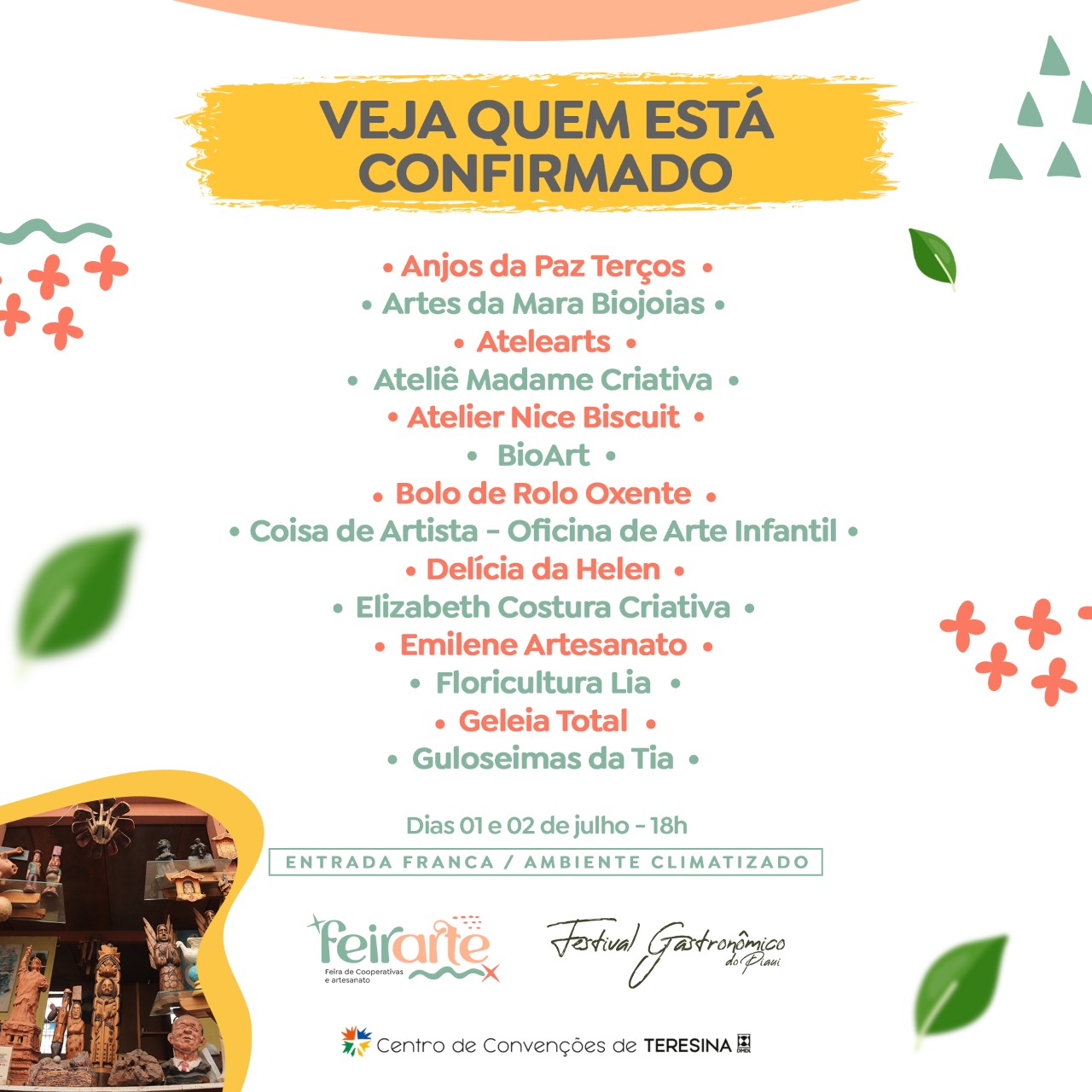 Nesta sexta (01) e sábado (02), o Centro de Convenções de Teresina recebe a Feira de Cooperativas e Artesanato – FeirArte e o Festival Gastronômico do Piauí. O evento vai contar com apresentações musicais gratuitas, comidas típicas, exposição de peças artesanais, além de uma vasta programação preparada para o público piauiense apreciar ao lado de toda família. Vale destacar que a entrada no evento é totalmente franca.