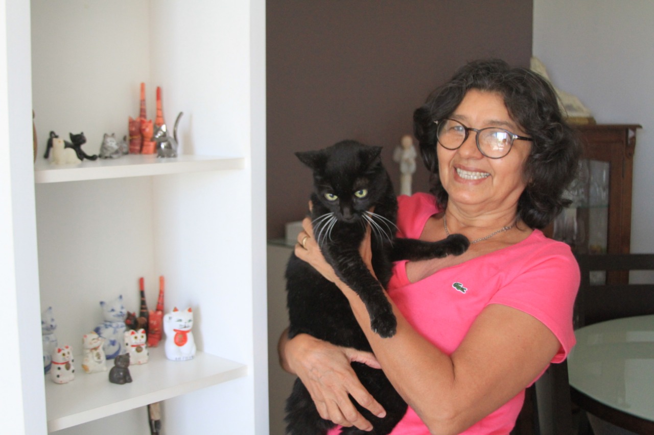 A rotina da gata também inclui uma alimentação premium. “Ela come primeiro a ração pastosa, então saímos para trabalhar. Quando chegamos 13h, eles vêm e renovamos a ração seca. Eles dormem muito”. Sim, eles. Além de Pantera, o Raj, que ficou arisco com a visita da reportagem e não quis posar para a foto, também fazem companhia as duas.