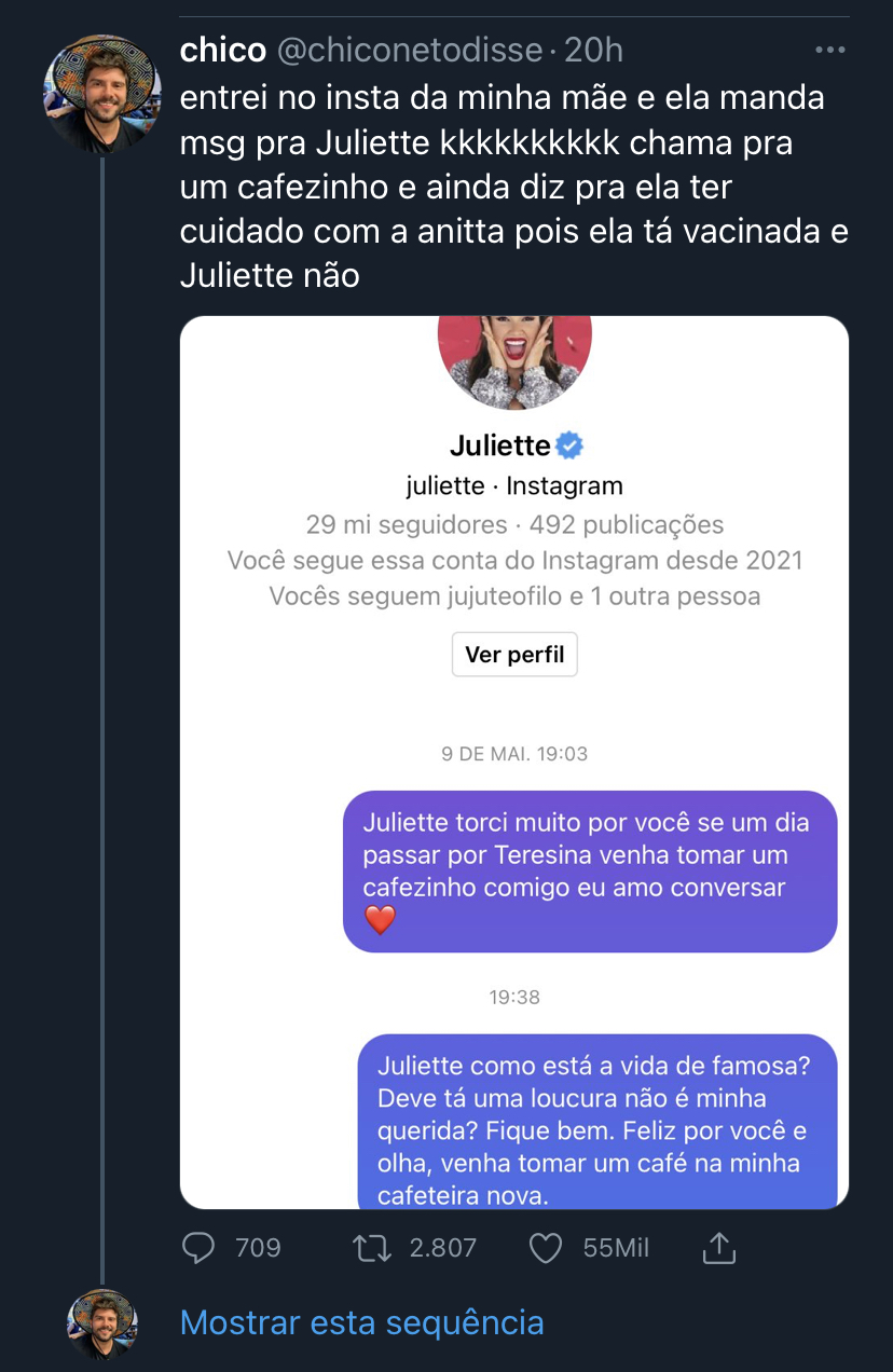 O perfil @choconetodisse fez um print do direct do Instagram da mãe ao descobrir que ela mandava mensagens para Juliette e postou no Twitter e, para surpresa, a nova milionária respondeu.