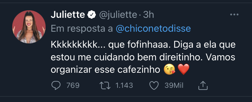 Além de chamar para um cafezinho, a fã pedia para Juliette se cuidar e ter cuidado com a Anitta, que está fora do Brasil, já que Juliette não está vacinada.