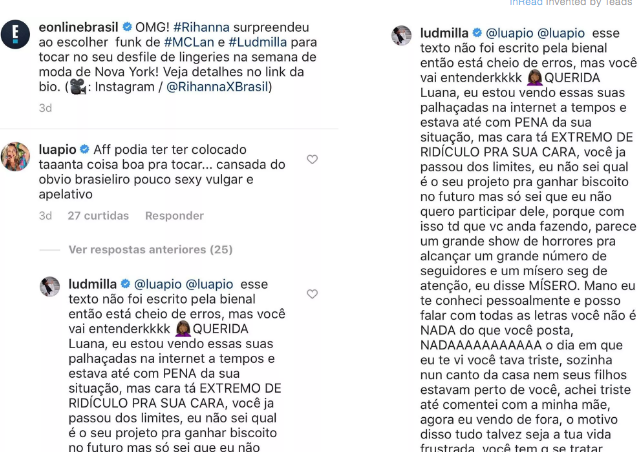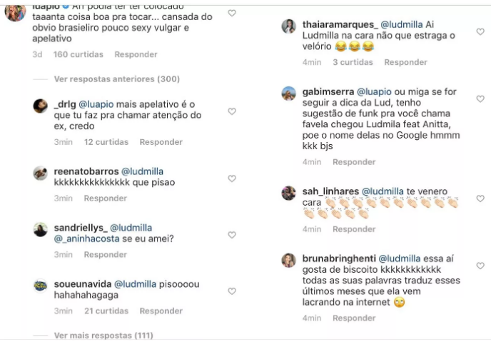 Ludmilla não deixou barato e respondeu o comentário com um texto longo: “Querida Luana, eu estou vendo essas suas palhaçadas na internet a tempos e estava até com PENA da sua situação, mas cara tá EXTREMO DE RIDÍCULO PRA SUA CARA, você ja passou dos limites, eu não sei qual é o seu projeto pra ganhar biscoito no futuro mas só sei que eu não quero participar dele, porque com isso td que vc anda fazendo, parece um grande show de horrores pra alcançar um grande número de seguidores e um mísero segundo de atenção, eu disse MÍSERO", escreveu a cantora.