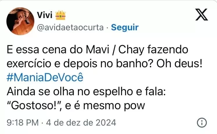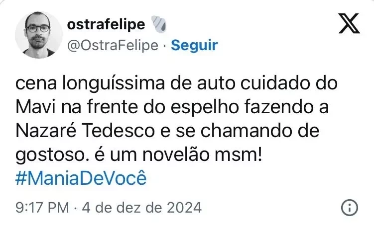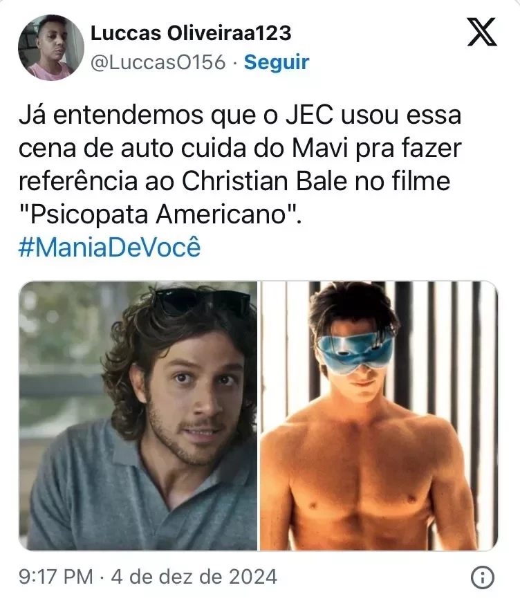 “Já entendemos que João Emanuel Carneiro usou essa cena de autocuidado do Mavi como referência ao Christian Bale no filme Psicopata Americano”, pontuou um fã no X.