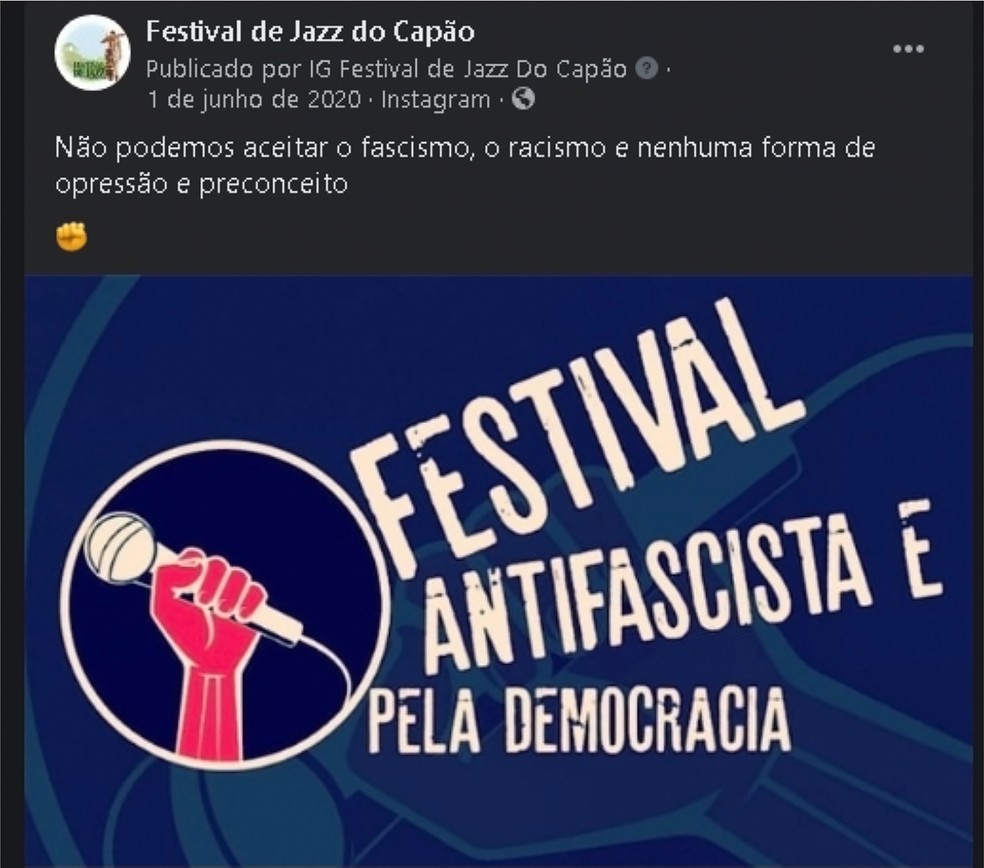 Um post de divulgação do evento em rede social faz apologia que a festa é antifascista.